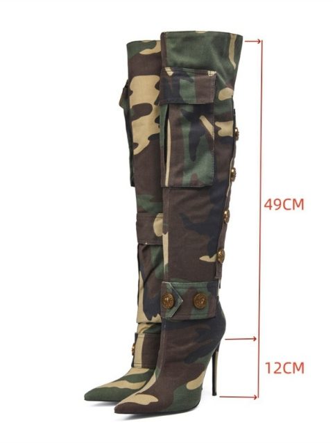 European and American Pointed High Heels Camouflage Rivets Fashion Plus Size Motorcycle Women’s Sleeve Trendy Knee Boots