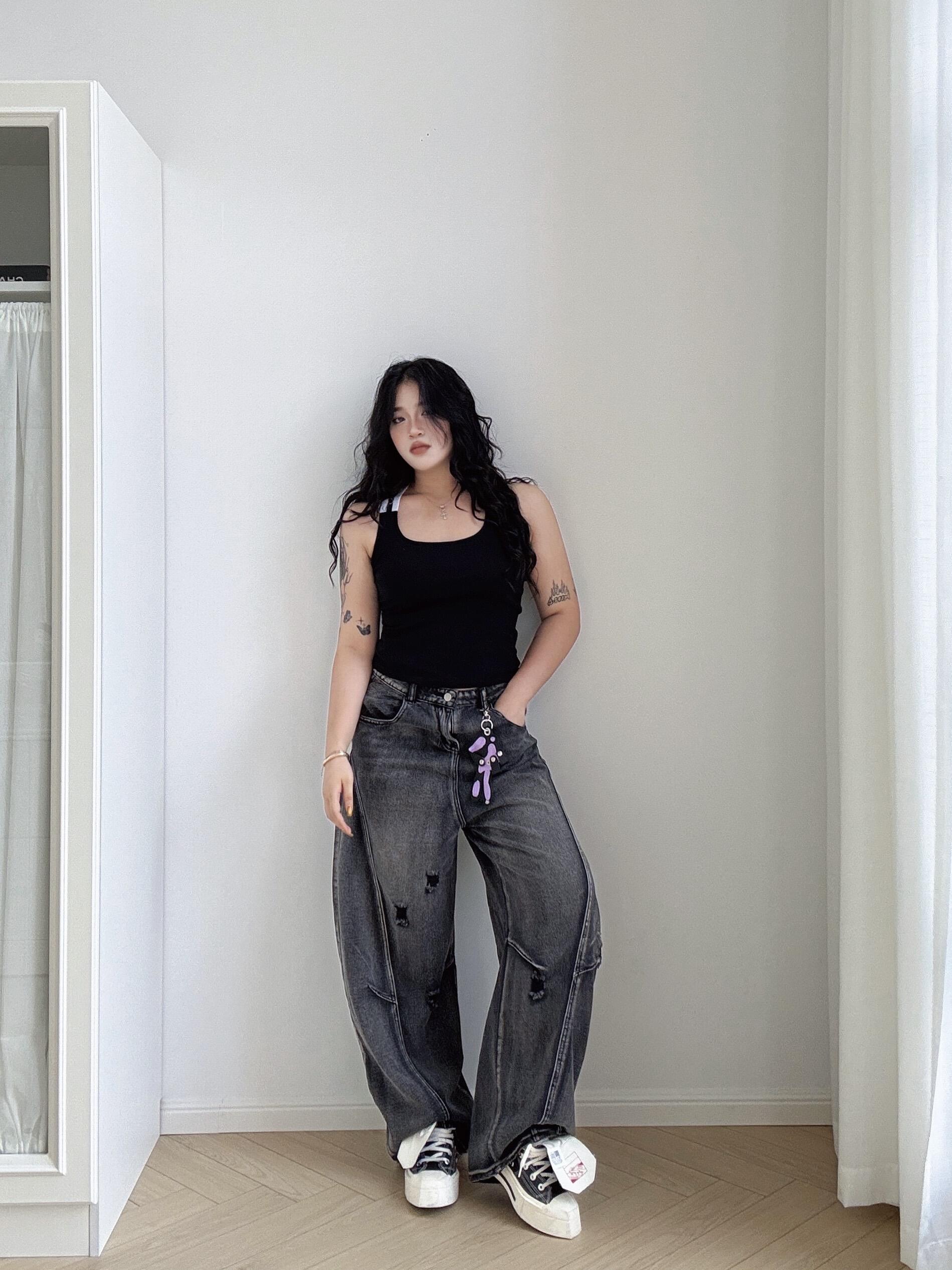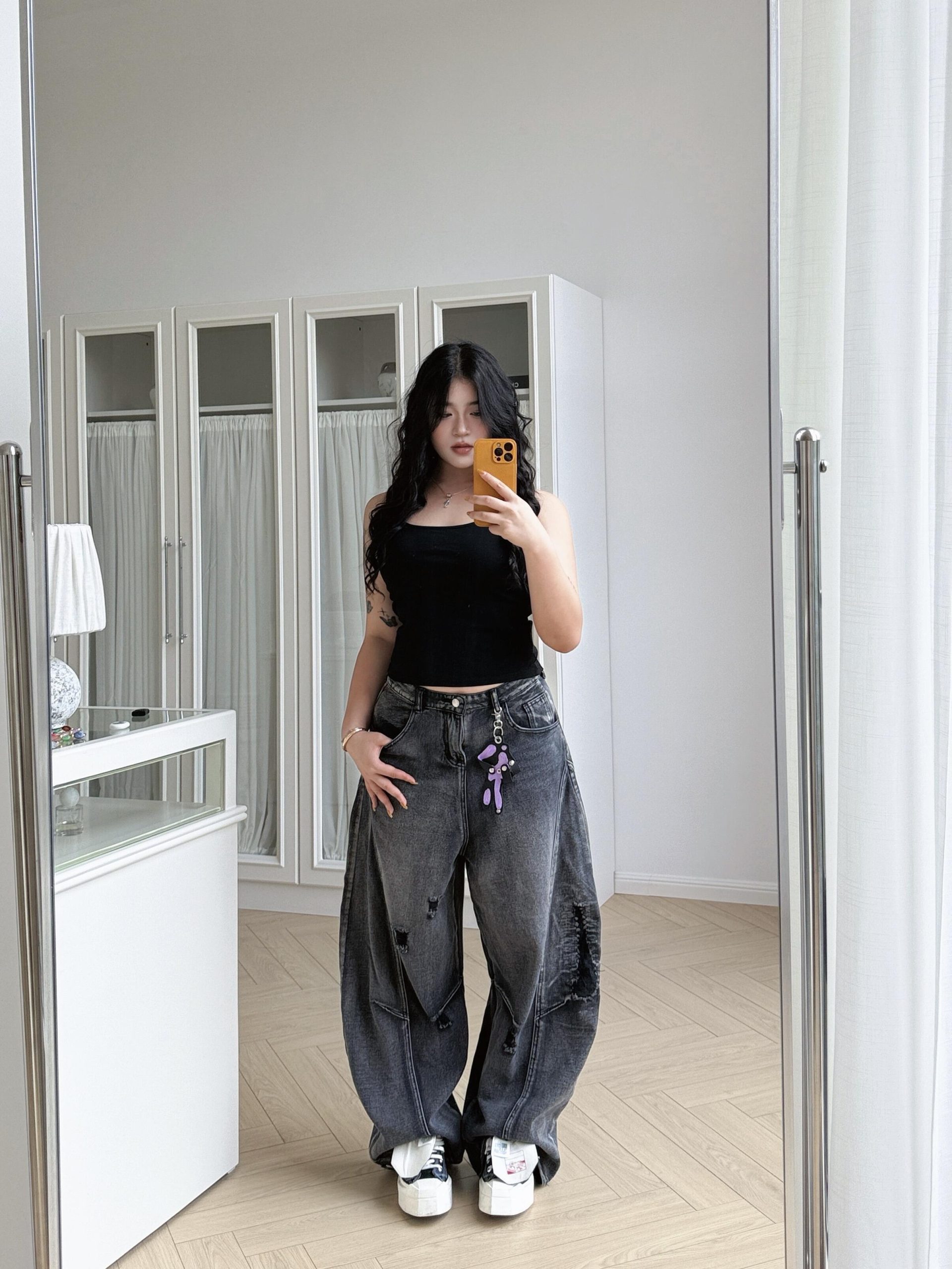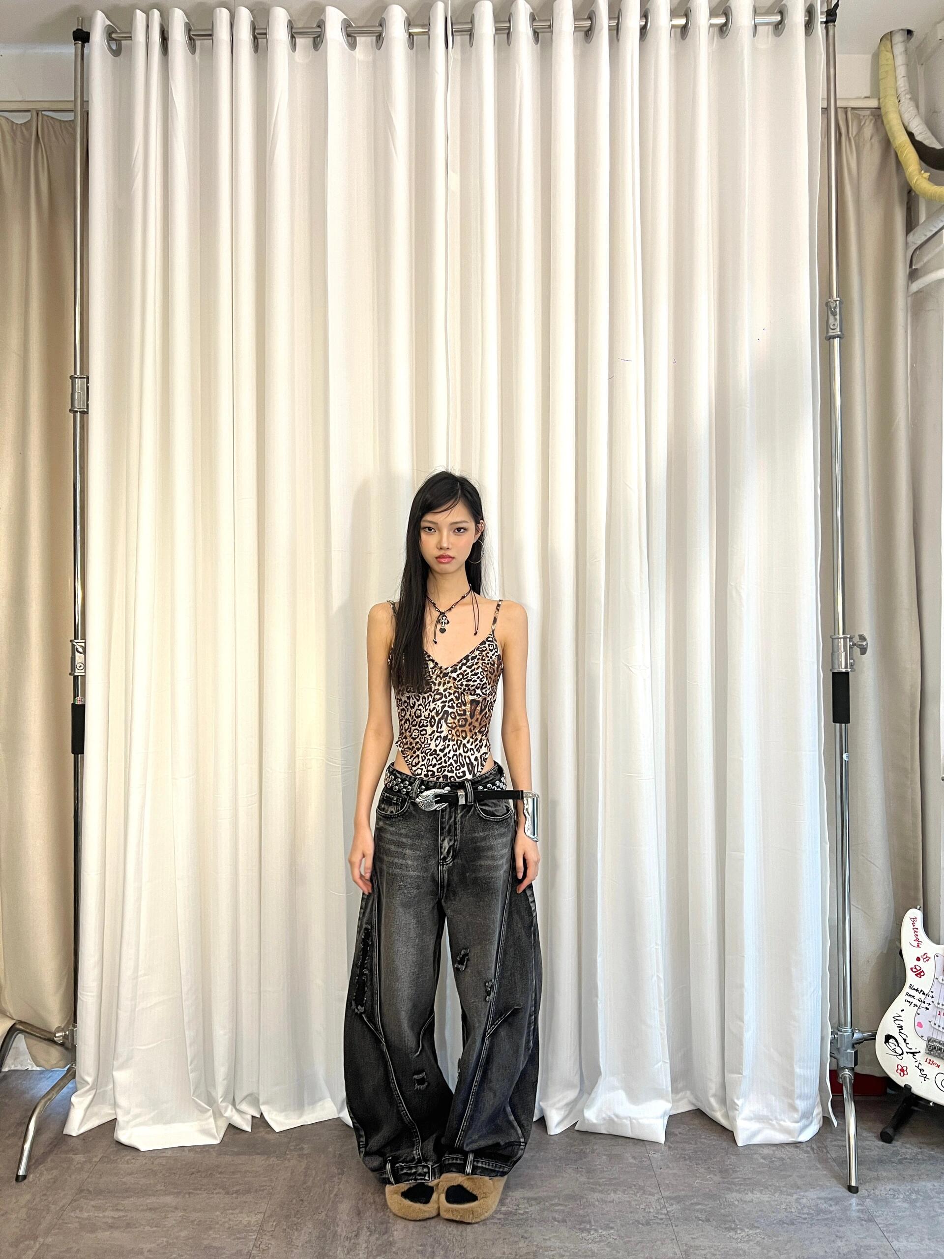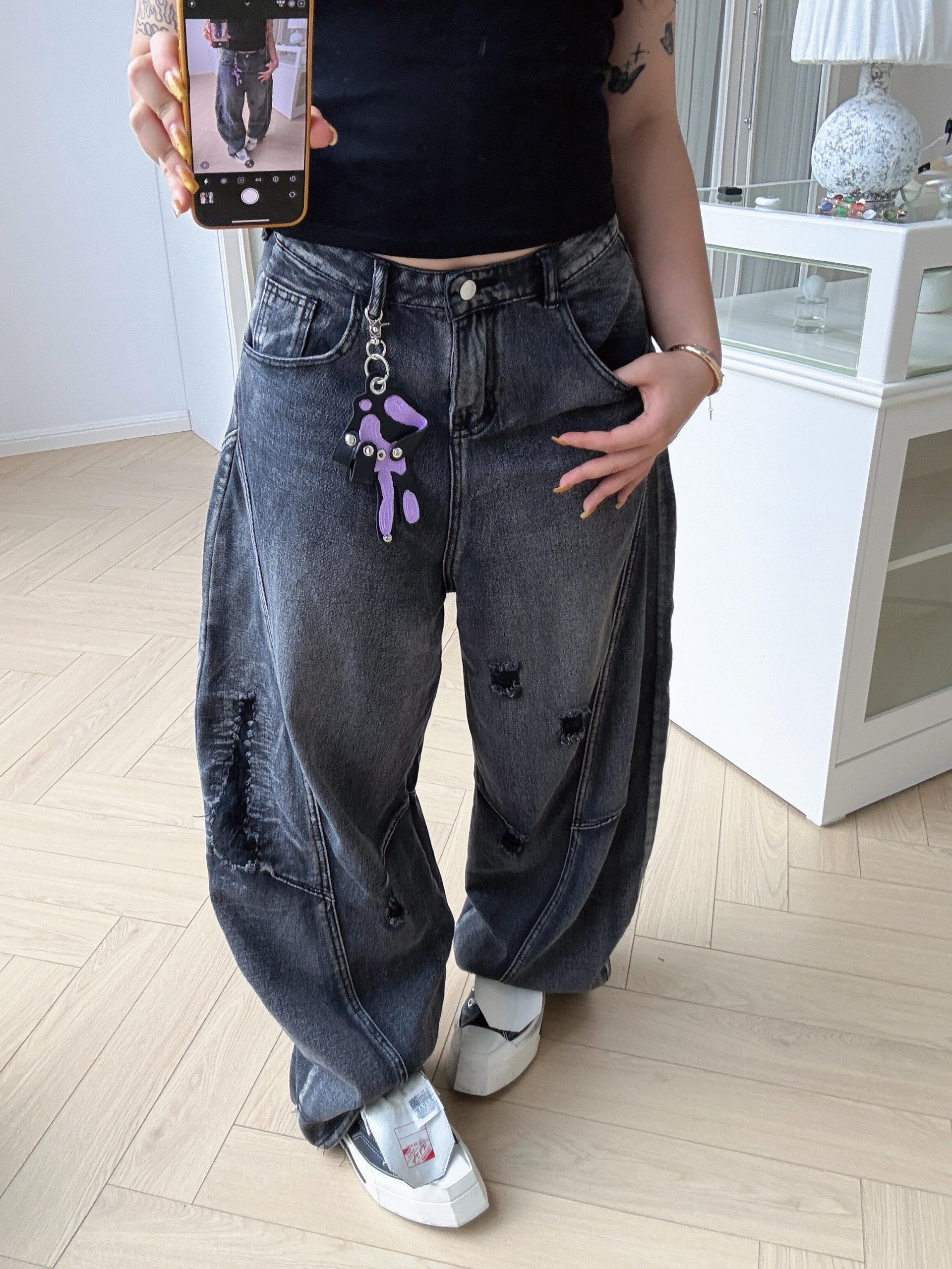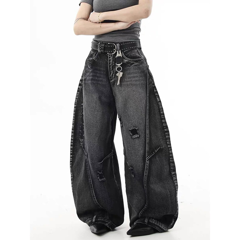 Y2K Black Graffiti Worn Out Womens Jeans High Waist Vintage Straight Baggy Denim Pants Street American Wide Leg Denim Trouser