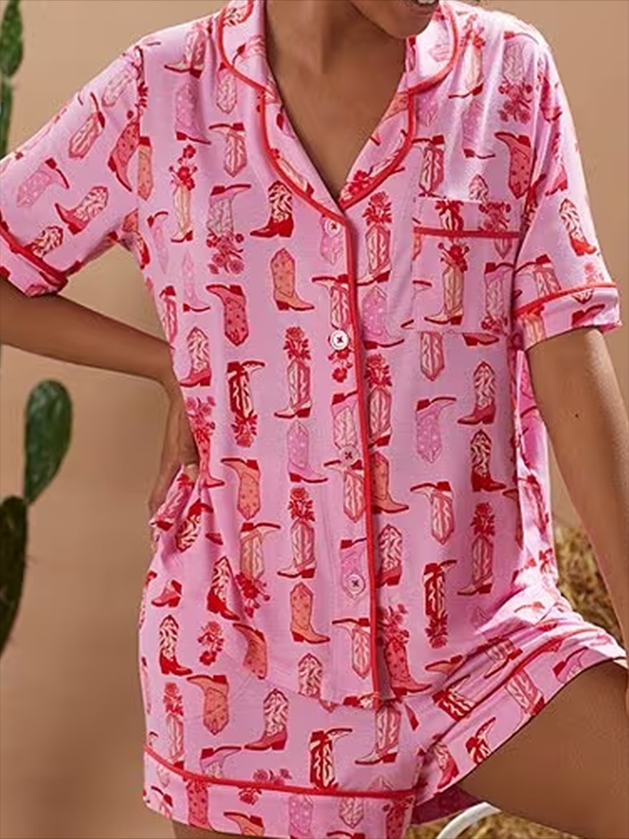 Y2k Bow Boots Print Satin Pajamas Short Set For Valentine's Day Satin Silk Pjs Sleepwear Loungewear Lounge Set for Women