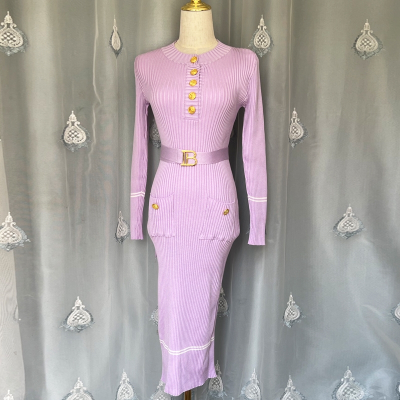 YuooMuoo 2025 Autumn Winter Women Knitted Dress Brand Fashion O-neck Buttons Bodycon Sweater Dress with Belt Lady Office Dress