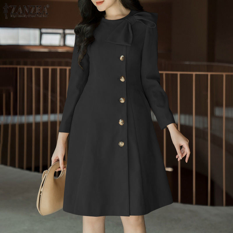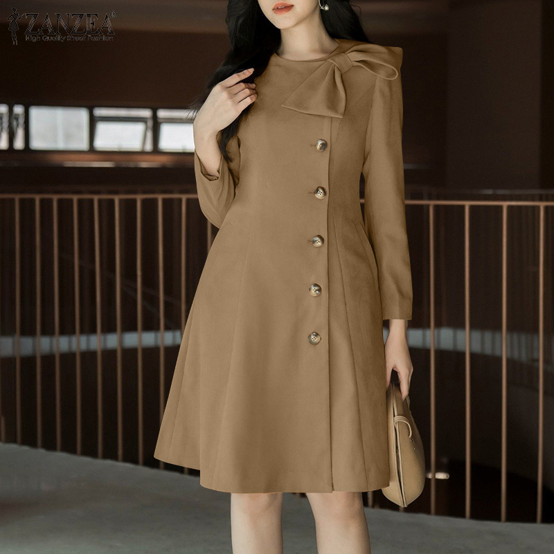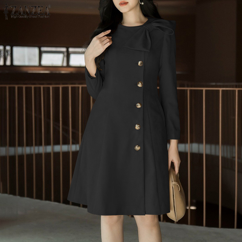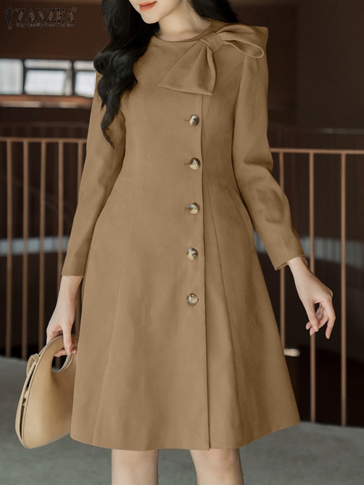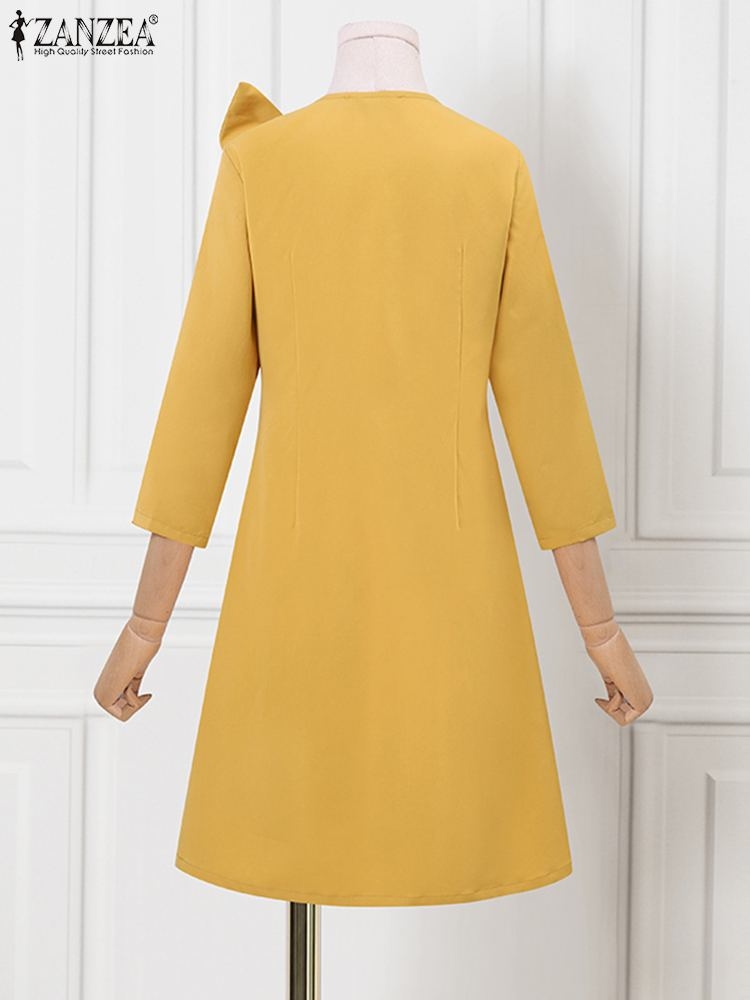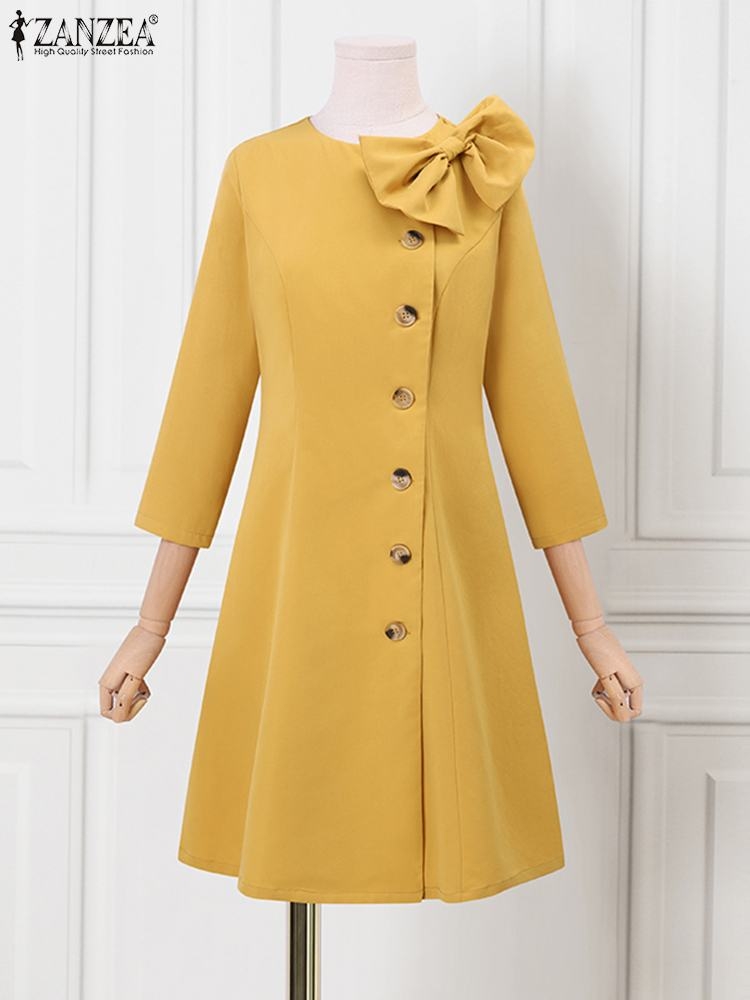ZANZEA 2024 Summer Elegant Party Sundress Women Bow Tie Neck Knee-Length Dress Casual 3/4 Sleeve Buttons Solid Office Vestidos