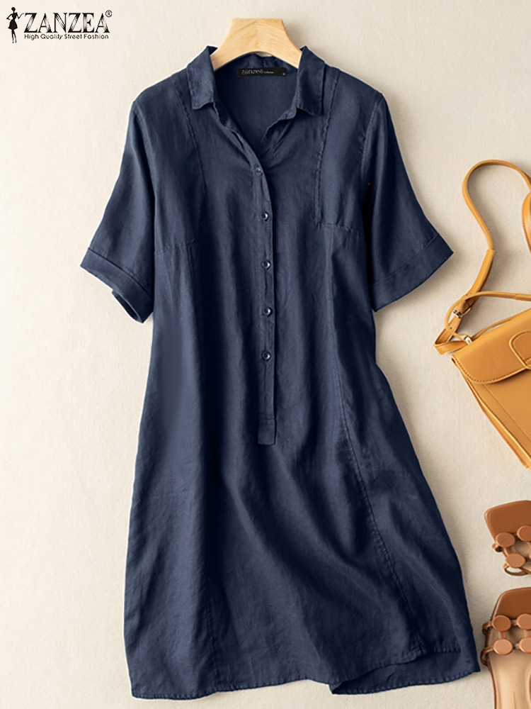 ZANZEA Summer Dress Elegant Short Sleeve Dresses Women Vintage Cotton Vestido O-Neck Button A-line Work Sundress Robe Femme