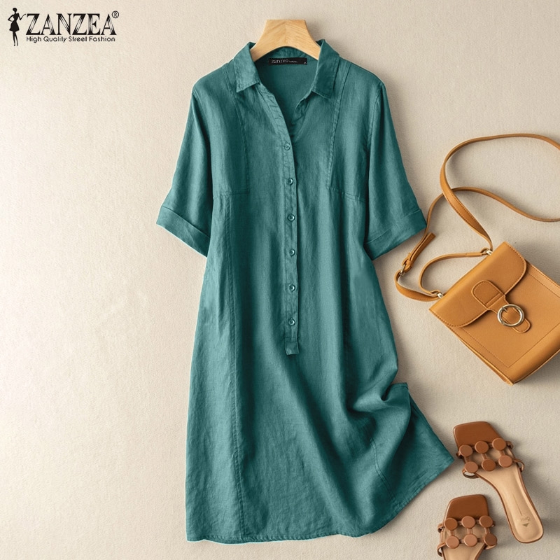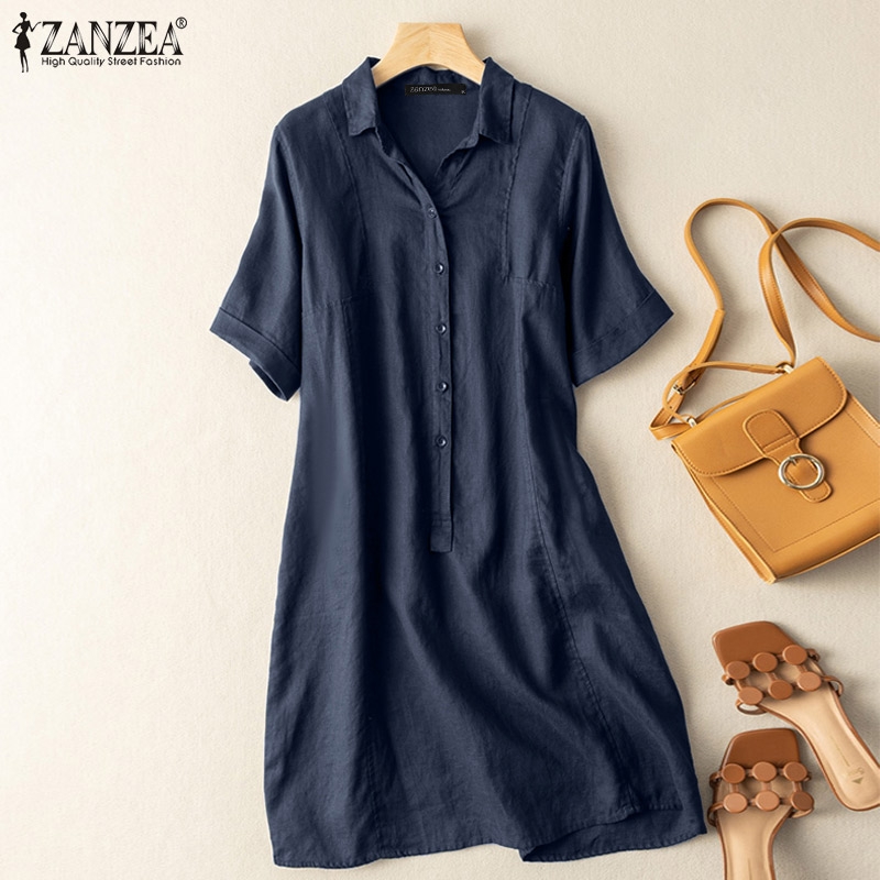 2 reviews for ZANZEA Summer Dress Elegant Short Sleeve Dresses Women Vintage Cotton Vestido O-Neck Button A-line Work Sundress Robe Femme