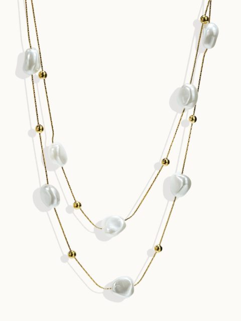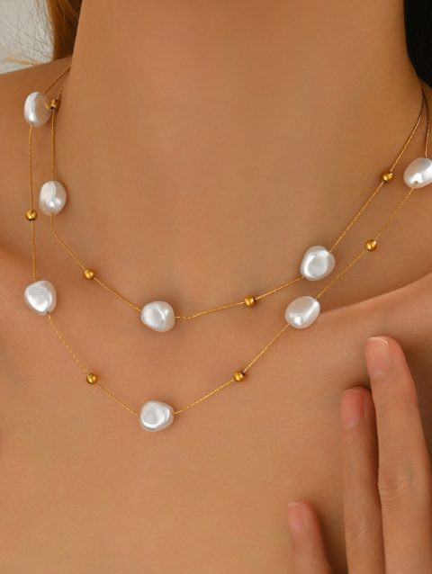 “Lxalry 18K Gold Plated Stainless Steel Faux Pearl Double Layer Necklace for Women – Elegant Tarnish-Free Hypoallergenic Jewelry