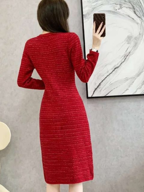 0908 Autumn Winter Red Office Sweater Dress Women Round Neck Buttons Knitted Dress Female Elegant Stretch Vestidos Knee-length
