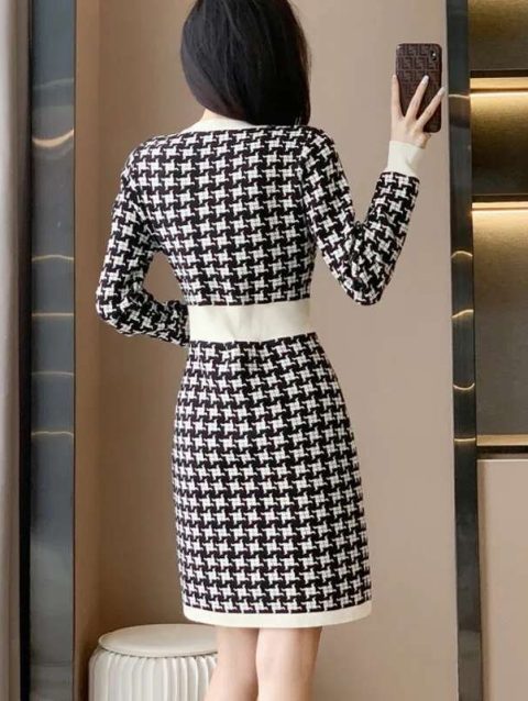 0906 Vintage Plaid Mini Dress Women Round Neck Short Sweater Dress Buttons Pockets Sexy Office Knitted Mini Dress Femme Elegant
