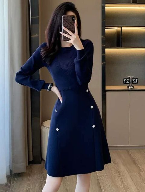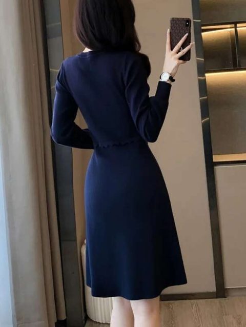 0903 Blue A-line Sweater Dress Women False Two Piece A-line High Waisted Knitted Dress Female Slim Stretch Short Dress Ladies