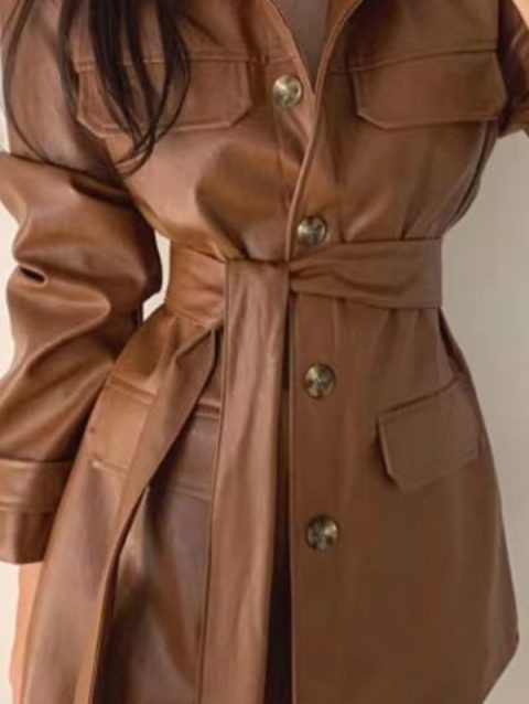 Chic Retro Long Sve Collar Single Button Multi ket Waist Cinched Leather Jaet Coat for Women mid Length Outerwear