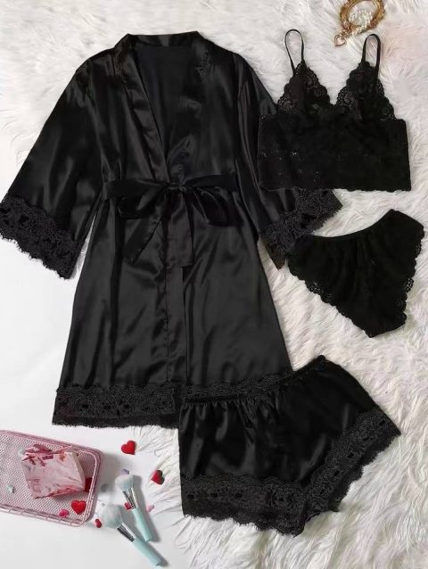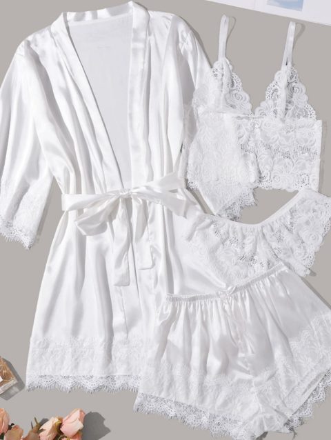4PCS Women’s Long Pajamas Set White Lace Satin Silk Night Lingerie Tops And Shorts Casual Sleepwear Loose Wedding Home Gown