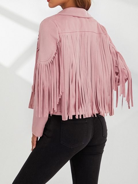 Women Spring Autumn Slim Long Sleeve Open Front Coat Solid Color Collared Jacket with Tassels Black/ Coffee/ Pink
