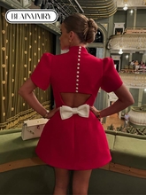 Women Red Bow Mini Dress Short Sleeve Fashion Pad Shoulder Dresses Backless Hollow Out Ladies Summer Chic A-line Party Vestidos