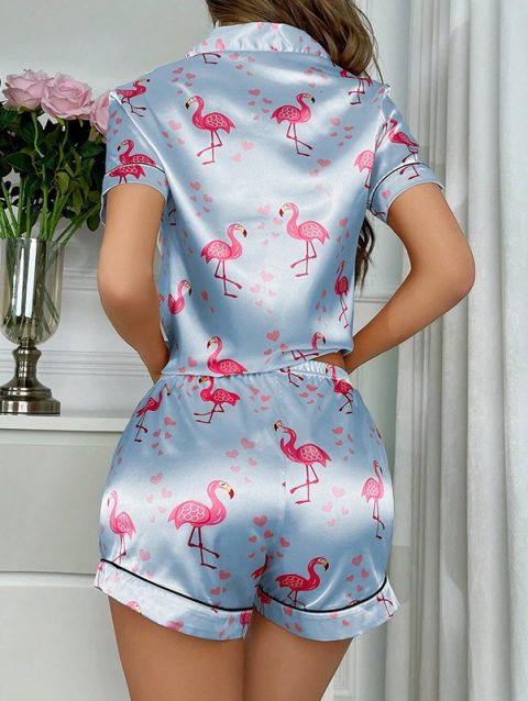 Women’s Heart-shaped Print Satin Pajama Pj Set Soft & Comfortable Short Sleeve Buttons Lapel Tops & Shorts Sleepwear Loungewear