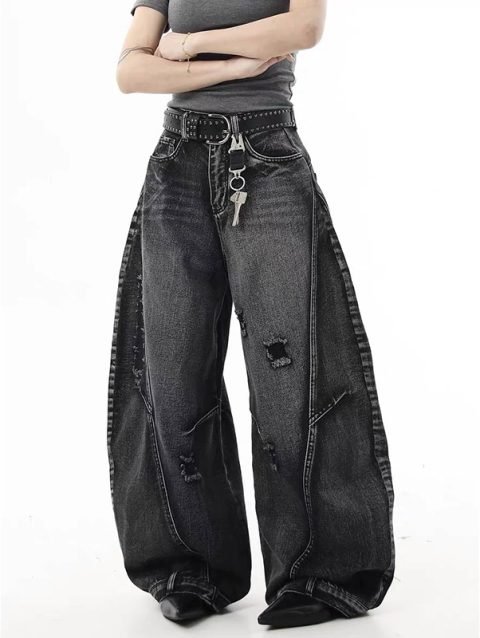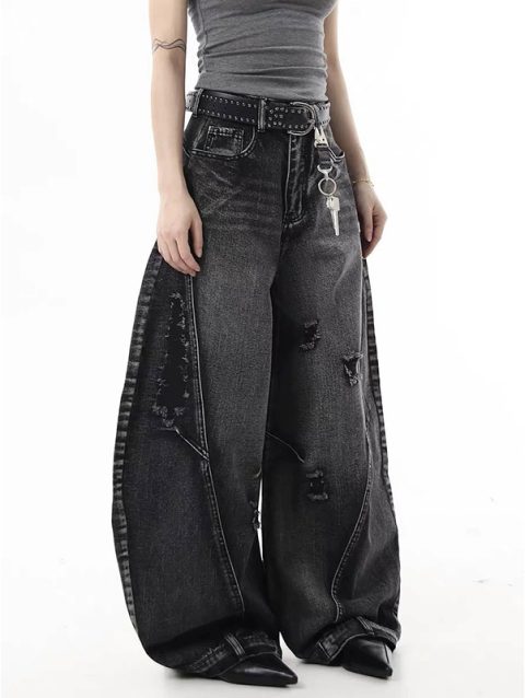 Y2K Black Graffiti Worn Out Womens Jeans High Waist Vintage Straight Baggy Denim Pants Street American Wide Leg Denim Trouser