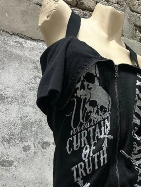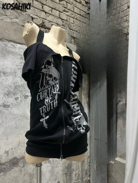 Y2k Aesthetic Skull Letter Printing Vintage Tops 2025 Streetwear Slash Neck Tshirts Women Grunge Dual Zippers Harajuku Tees