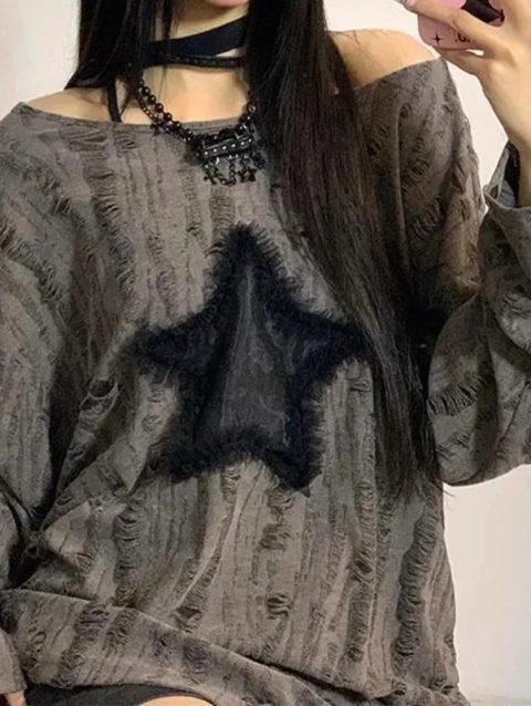 Y2K Hole Star Print T-Shirt Women Fashion Streetwear Off Shoulder Tops Summer Oversized Kpop Long Sleeve Loose Tees Ladies New