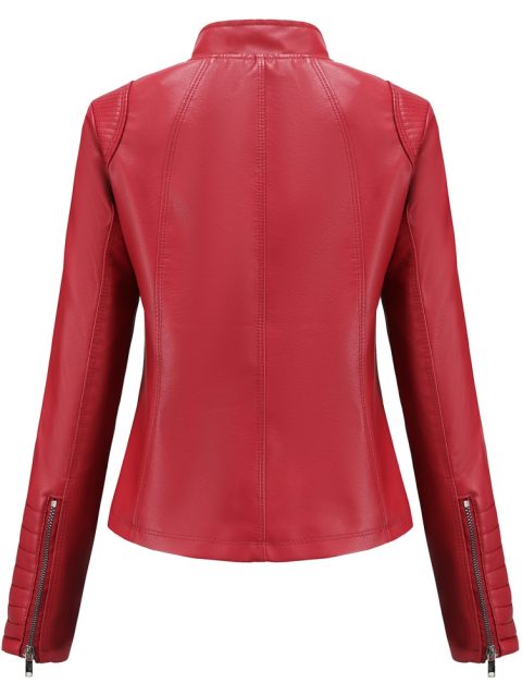 Bright Red V-neck Leather Jacket Women’s, Fashion Slim PU Coat, Black Short Outerwear Asia Size XS S M L XL XXL