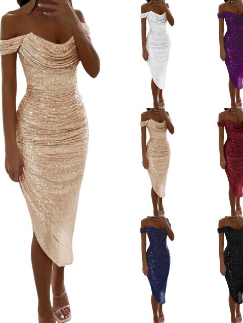 Off Shoulder Sequin Prom Womens’ Dresses Sparkly Midi Evening Party Dress Cowl Neck Homecoming Dress Cocktail Party Dresses
