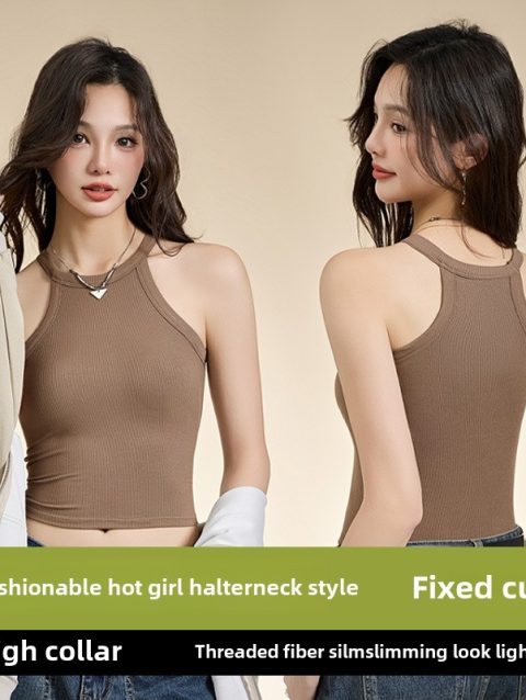 Threaded Halter Neck Camisole Top With Build-in Bra High Elastic Slim-fitting Sling Fixed Cup Breathable Women Underwear
