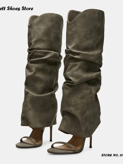 Women’s Pleated Summer Knee-high Boots Elegant Round Open Toe Stiletto Fashion Boots Street Style Party Dress Solid Modern Boots