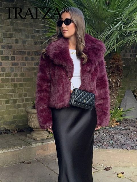 TRAFZA Winter Casual Women Solid Faux Fur Jackets 2024 Lapel Long Sleeve Patchwork Buttons Designer Coats Female Fashion Outwear