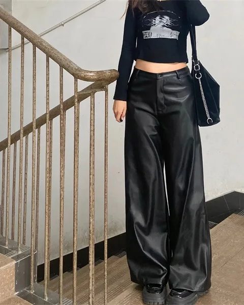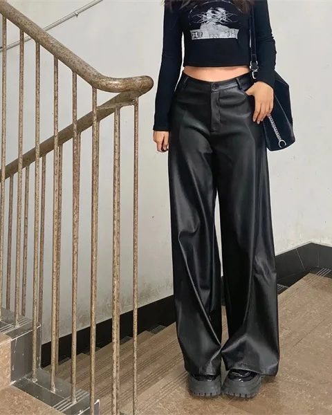 Plus Size High-Waisted Straight-Leg Black PU Leather Trousers Women’s Casual Floor-Length Spring Autumn Narrow Wide-Leg Trousers