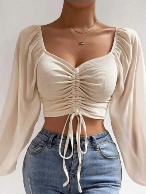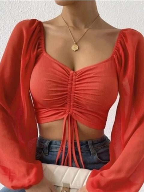 Sexy Women Mesh Lantern Sleeves Drawstring Wrap Chest Bare Midriff T Shirt Women Long Sleeves Bottoming