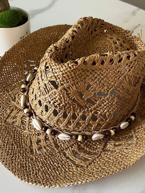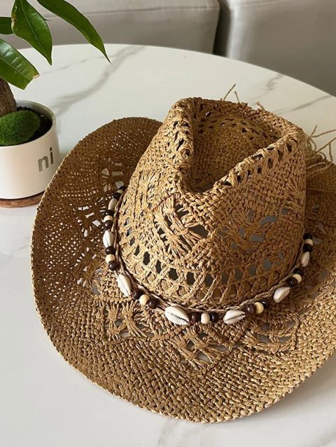 Summer Bohemian Shell Straw Hat Beach Women Men Cowboy Hats Wooden Beads Hollow Out Western Wide Brim Sun Hat Holiday Cap