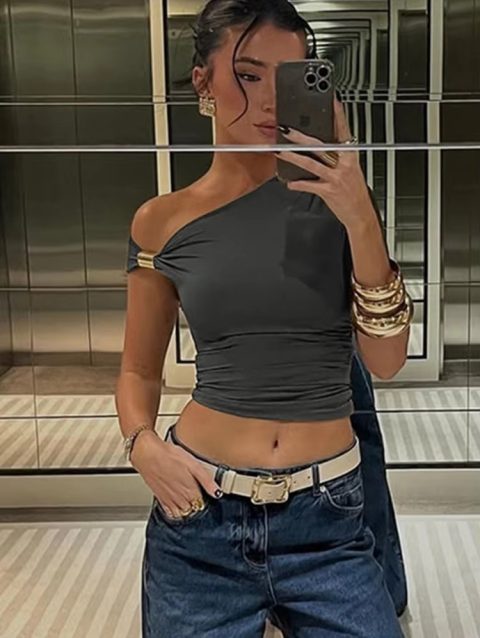 Weird Puss Irregular Off Shoulder T-Shirts Women Ruched Fashion Skew Collar Single Sleeve Daily Casual Solid Simple Streetwear